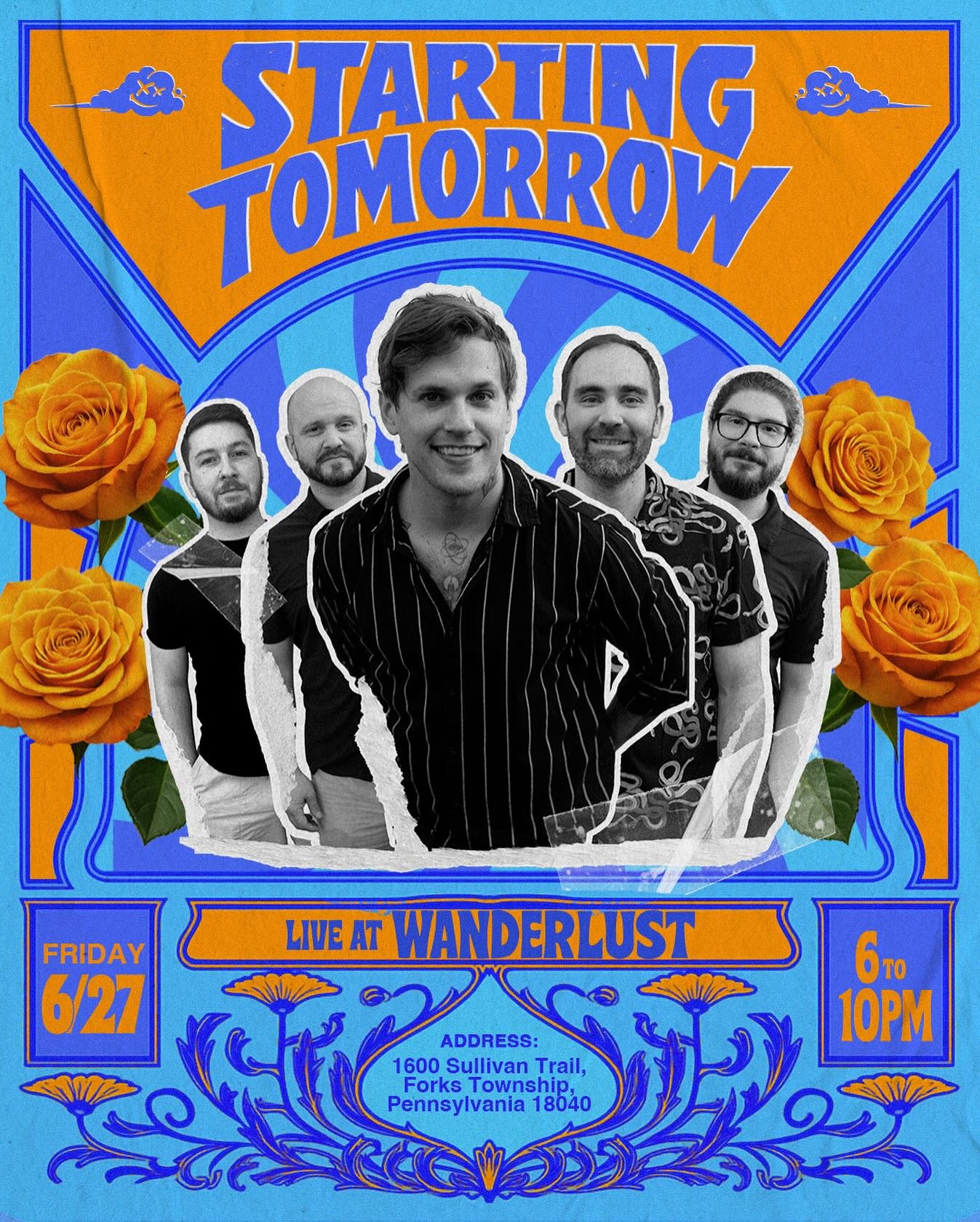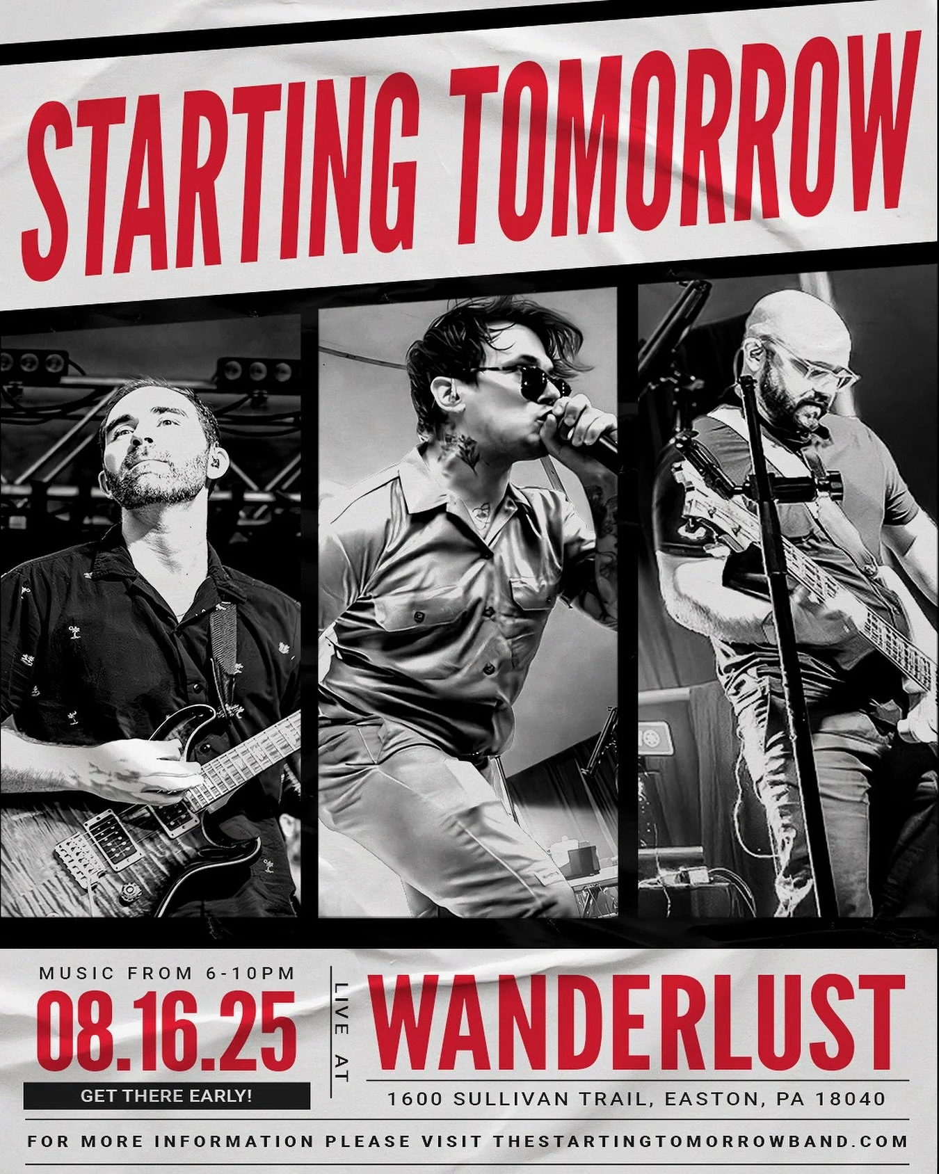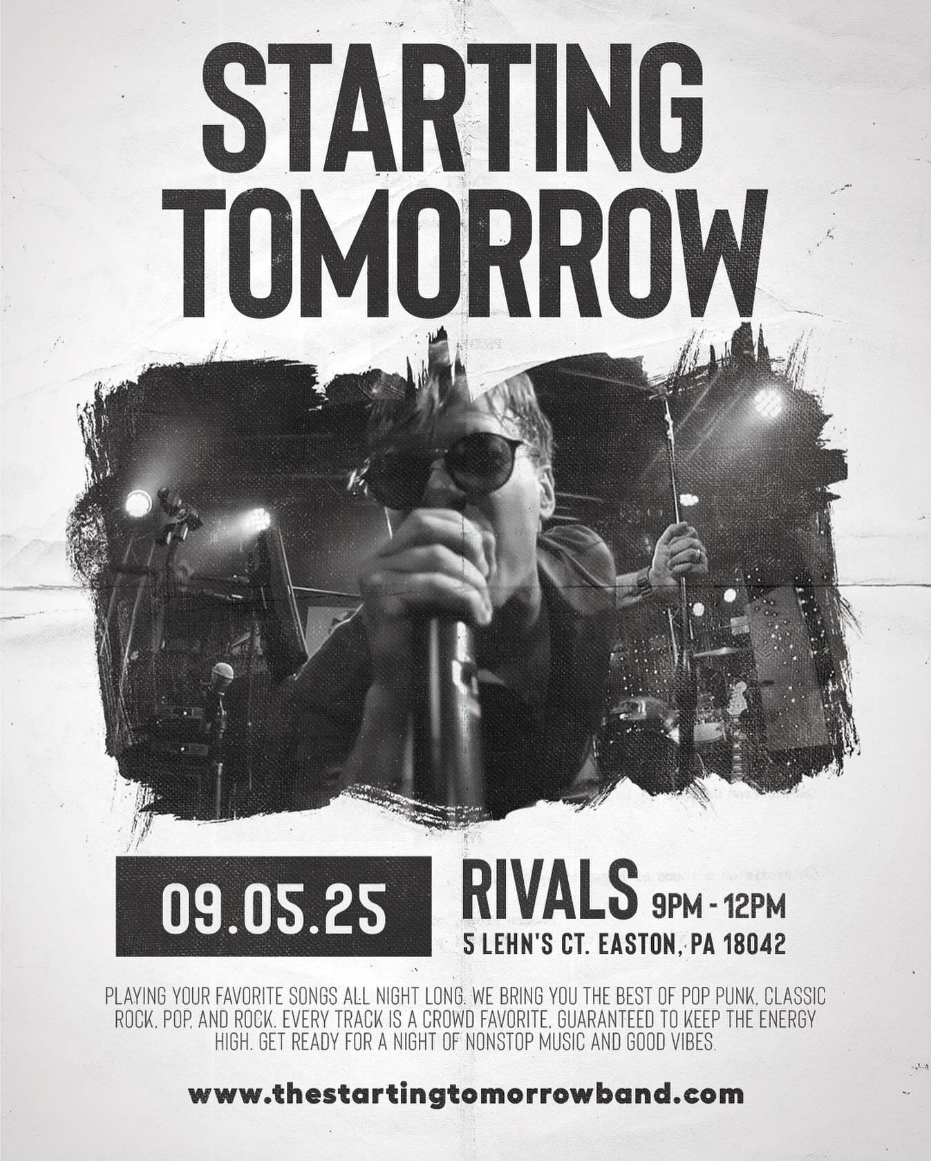 Your favorite cover band Starting Tomorrow delivers your favorite hits from the past….today! Formed in 2016 in the Lehigh Valley, the band has become a staple in the live music scene, performing rock, alternative, country, and pop covers from the 1960s to the present. Known for their unique style and energetic performances, they incorporate mashups and meta-covers into their sets. Starting Tomorrow has been a featured act at Musikfest from 2017 to 2024, including headline performances at Plaza Tropical in 2023 and 2024, and an appearance at Festplatz in 2022. Their dynamic and eclectic setlists have graced big stages, festivals, tailgates, bars, pubs, parties, and weddings.