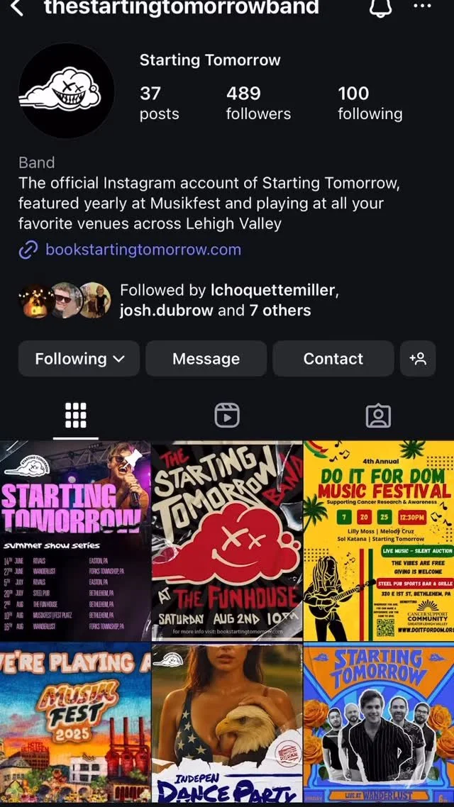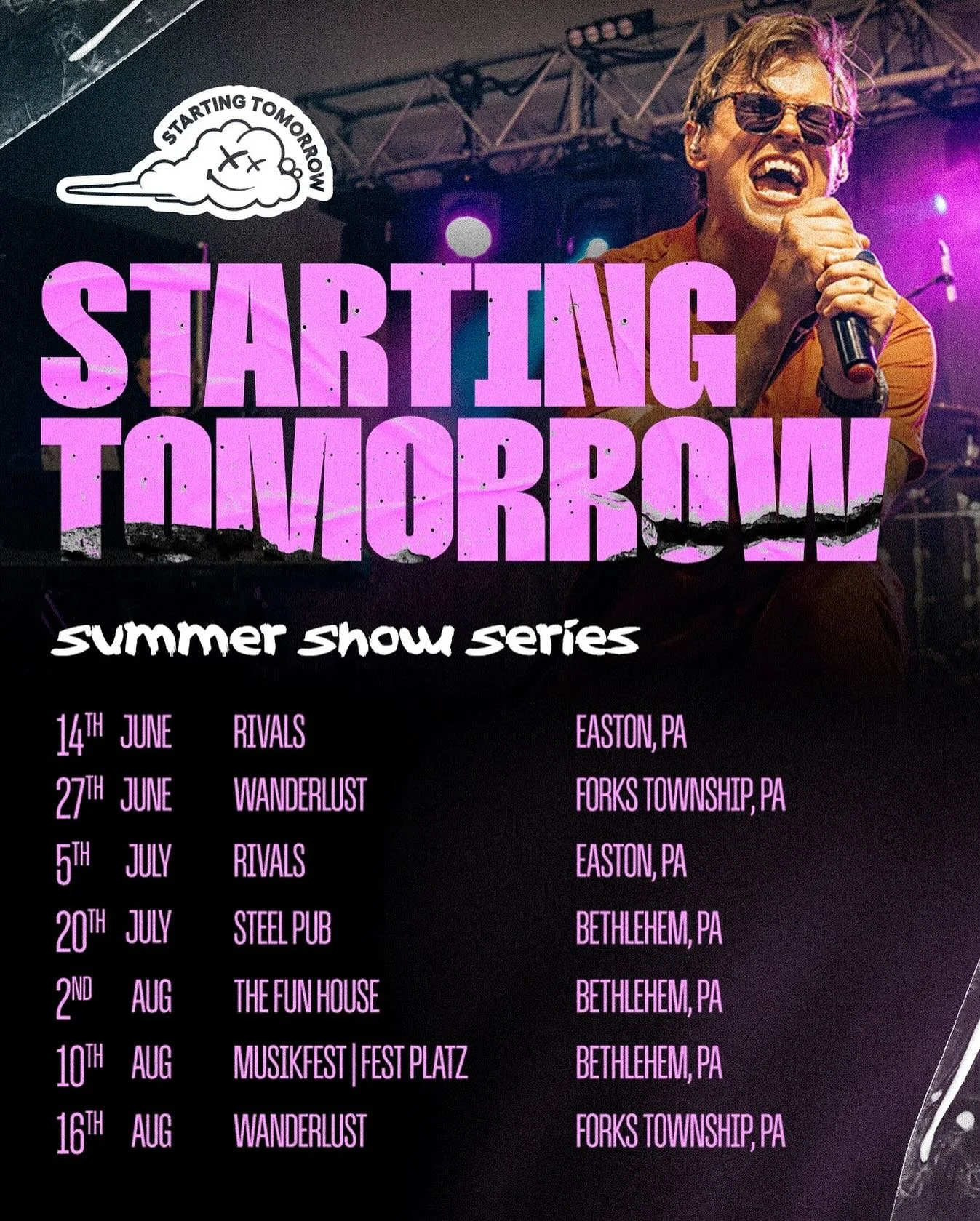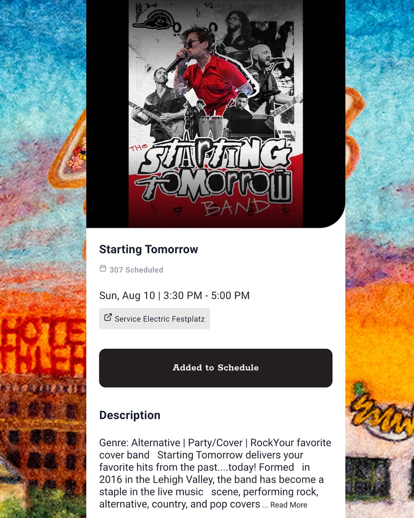 Your favorite cover band Starting Tomorrow delivers your favorite hits from the past….today! Formed in 2016 in the Lehigh Valley, the band has become a staple in the live music scene, performing rock, alternative, country, and pop covers from the 1960s to the present. Known for their unique style and energetic performances, they incorporate mashups and meta-covers into their sets. Starting Tomorrow has been a featured act at Musikfest from 2017 to 2024, including headline performances at Plaza Tropical in 2023 and 2024, and an appearance at Festplatz in 2022. Their dynamic and eclectic setlists have graced big stages, festivals, tailgates, bars, pubs, parties, and weddings.